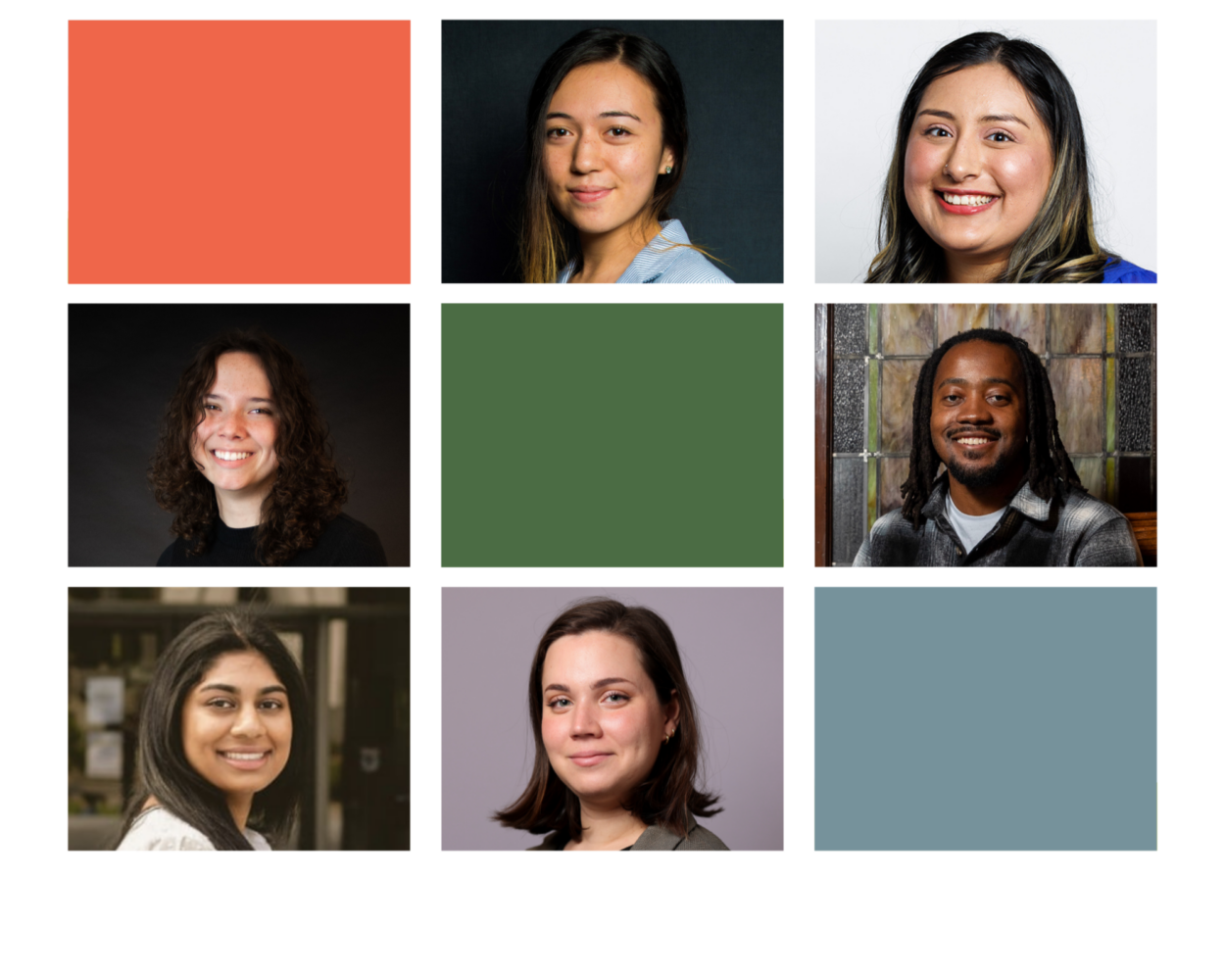 From left to right, starting at the top: Sara Willa Ernst, Celeste Gracia, Jillian Taylor, Ethan Bakuli, Anika Nayak, and Adriana Pérez.